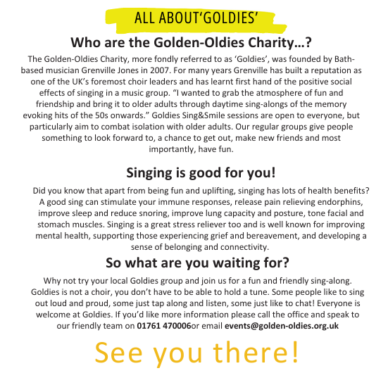 Goldies What's on Mar 30 Written By Steve Band When: Second Friday of the month – 10.30am-11.30amWhere: Acacia Room Email: events@golden-oldies.org.uk Steve Band